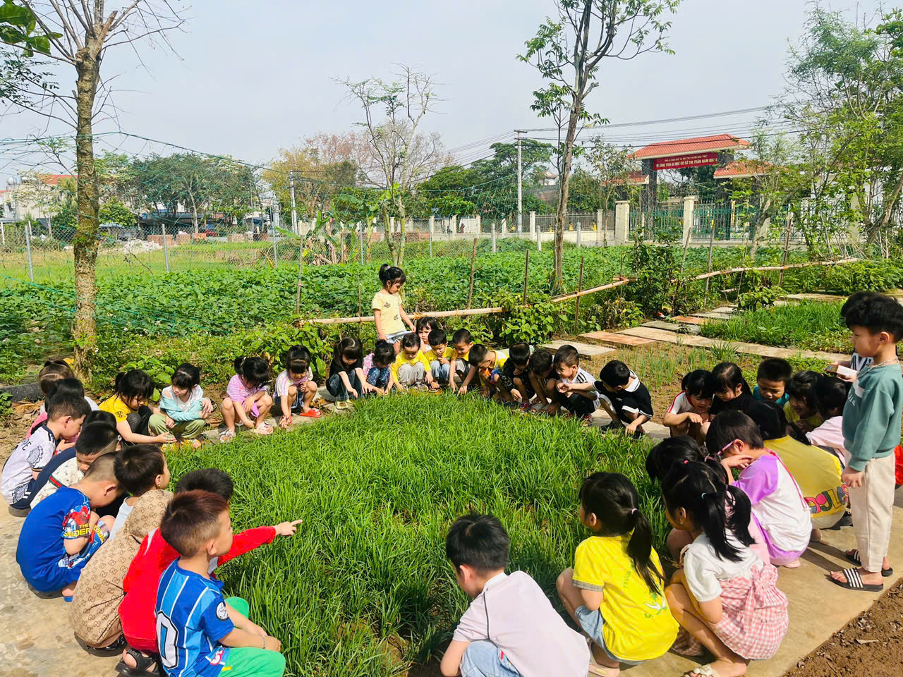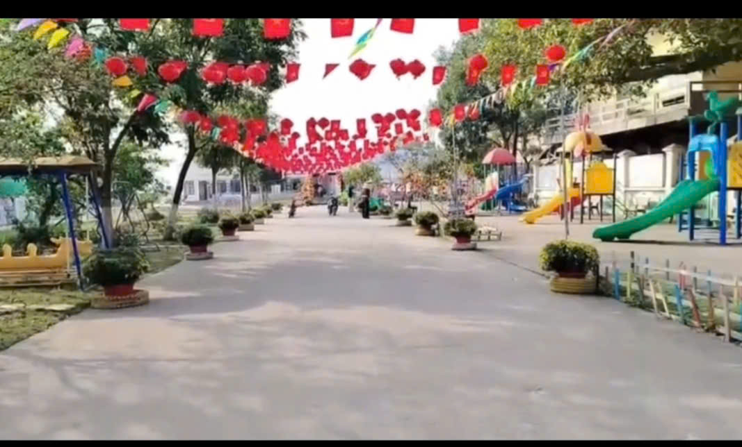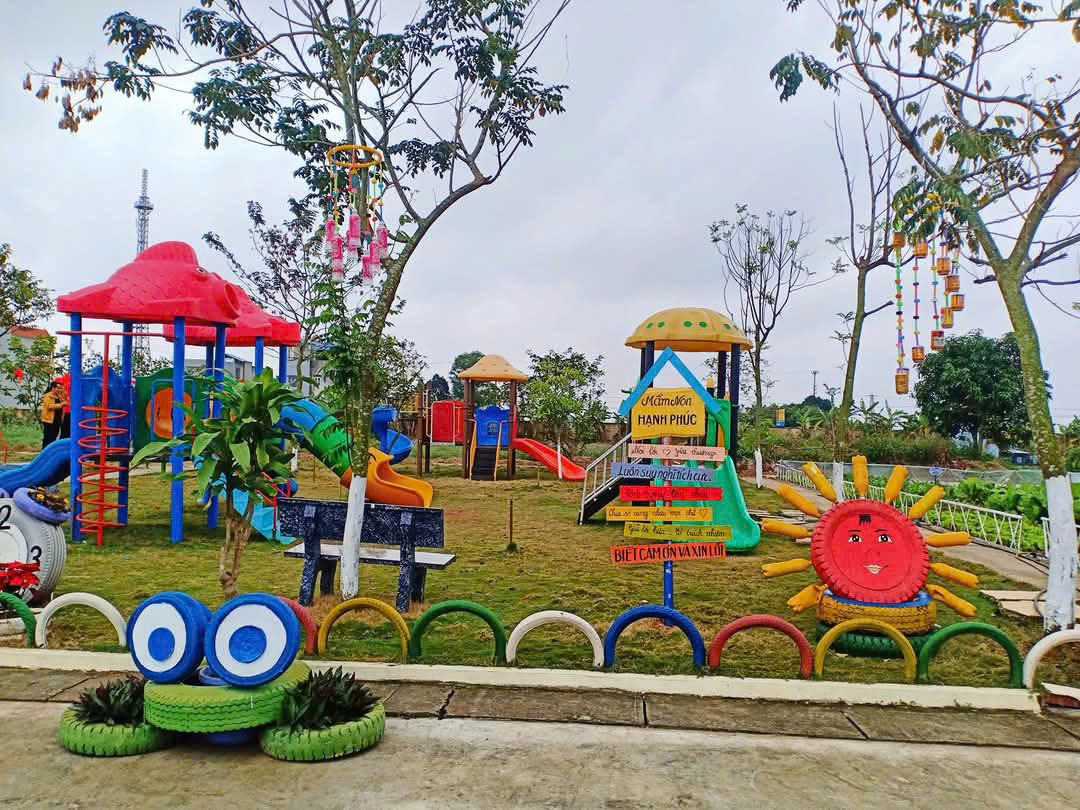 Khuôn viên được phủ xanh bằng nhiều cây bóng mát, vườn rau, vườn hoa, khu vui chơi ngoài trời phong phú giúp trẻ được học mà chơi, chơi mà học trong không gian mở, tự nhiên và an toàn.